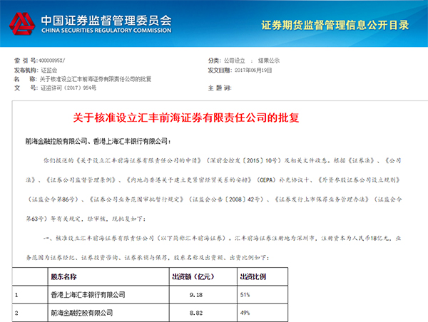 6月30日,香港回歸20周年的前一天,證監(jiān)會(huì)批準(zhǔn)設(shè)立匯豐前海證券有限責(zé)任公司(以下簡(jiǎn)稱匯豐前海證券)、東亞前海證券有限責(zé)任公司(以下簡(jiǎn)稱東亞前海證券),為前海帶來“大禮包”。