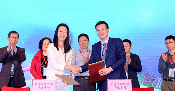 會上,在宋君強院士及國家自然科學基金委、科技部、廣東省經信委、中山大學等單位代表的見證下,李劍峰與國家超級計算廣州中心主任盧宇彤代表雙方簽署了深圳前海分中心合作協議。