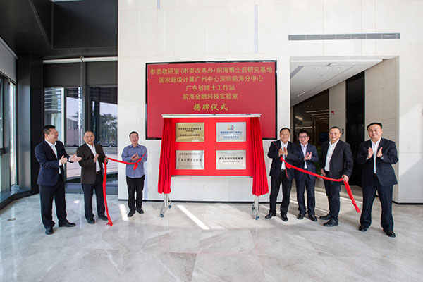 簽約儀式結束后,杜鵬、孫波等領導共同為市委政研室前海博士后研究基地、國家超級計算廣州中心深圳前海分中心、廣東省博士工作站和前海金融科技實驗室等創(chuàng)新載體和研究平臺揭牌。