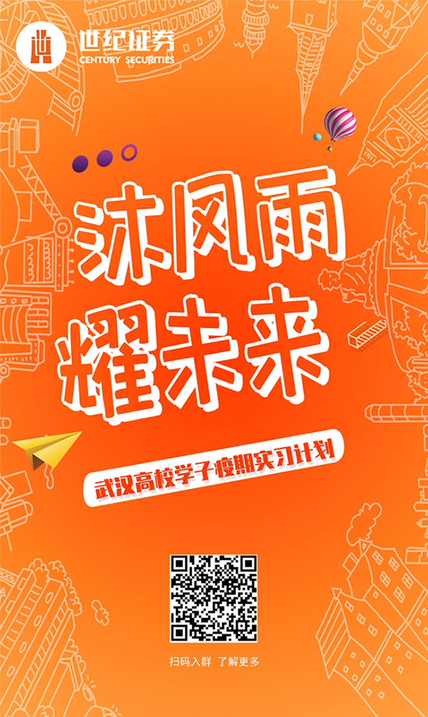 此外,世紀證券積極響應武漢高校學子的實習和就業需求,啟動了“沐風雨 耀未來”武漢高校學子疫期實習計劃,面向目前就讀于武漢地區高校、因疫情原因無法返校的全日制本科及以上學歷在校學生,為優秀學子提供職業發展平臺。應聘學子可按照“就近原則”在世紀證券總部和60家分公司、營業部中選擇疫情較輕地區的崗位,在世紀證券的統籌安排下參加在線“云面試”獲取實習機會。
