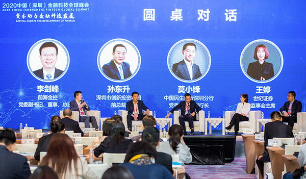 隨后的圓桌對(duì)話環(huán)節(jié)由前海金控黨委副書記、董事、總經(jīng)理李劍峰主持。深圳市創(chuàng)新投資集團(tuán)前總裁孫東升,中國民生銀行股份有限公司深圳分行黨委委員、副行長(zhǎng)莫小鋒,世紀(jì)證券監(jiān)事會(huì)主席王婷,前海中船股權(quán)投資基金副總經(jīng)理倪穎圍繞“資本助力金融科技發(fā)展”展開研討。