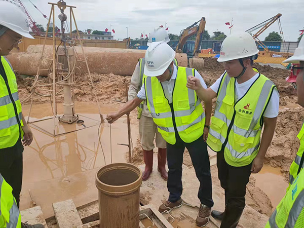 項目主體工程樁共有243根,其中抗壓樁44根,直徑為2.2米、2.4米,樁端入微風化混合花崗巖500mm;抗壓兼抗拔樁199根,直徑為1.2米,樁端持入中風化混合花崗巖4米。工程樁全部采用旋挖鉆孔混凝土灌注,計劃高峰期投入六臺旋挖鉆機。首樁澆筑預示著項目永久結構正式開始施工,相關數(shù)據的試驗獲取對后續(xù)施工開展具有指導意義。