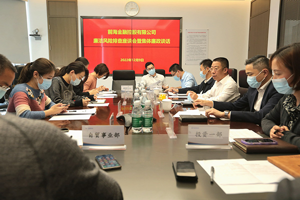 為進一步夯實黨風廉政建設主體責任,規范權力運行監督,有效防范廉潔風險,近日,前海金控公司紀委書記、監事會主席王耘組織召開公司廉潔風險排查座談會暨集體廉政談話,各部門負責人參加會議。