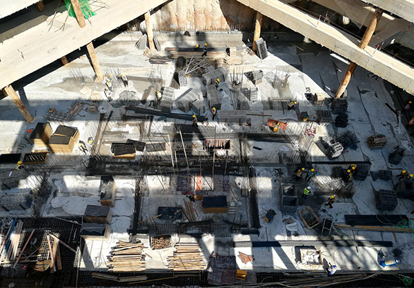 此次首塊澆筑底板位于地塊北區(qū),基底地質(zhì)條件復(fù)雜,土質(zhì)含水率較高,施工條件較差。經(jīng)過前期暗埋排水、設(shè)置集水井等措施,有效降低了土質(zhì)含水量,克服了多工種同時(shí)作業(yè)的不利影響。經(jīng)過33小時(shí)的連續(xù)奮戰(zhàn),進(jìn)場罐車達(dá)342車次,共計(jì)澆筑混凝土2733m³,最終打贏了這場攻堅(jiān)戰(zhàn)。