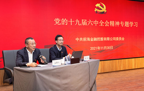 為深入學習貫徹黨的十九屆六中全會精神,及時做好全會精神的宣傳和解讀工作,11月30日,前海金控黨委召開專題宣講會,邀請深圳市委宣講團成員、深圳改革開放干部學院黨委委員、教育長宮正教授就黨的十九屆六中全會精神作專題宣講。市委黨史學習教育第九巡回指導組副組長賴維斌同志和唐霄峰同志到現場指導。會議由公司黨委書記、董事長孟曉同志主持,公司領導、各黨支部書記、部門負責人和全體黨員參加會議。